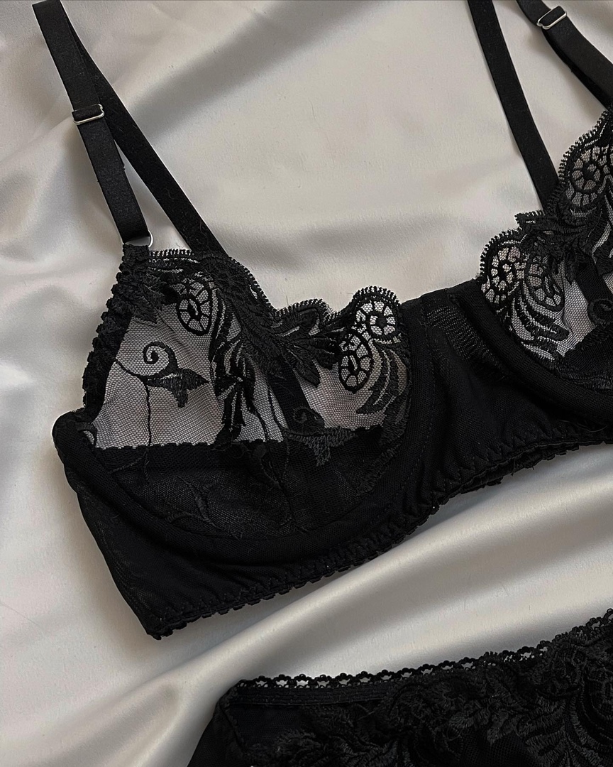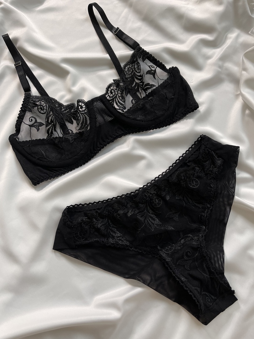 Выполнен из неэластичной вышивки на чашках и эластичной сеточки на стане
